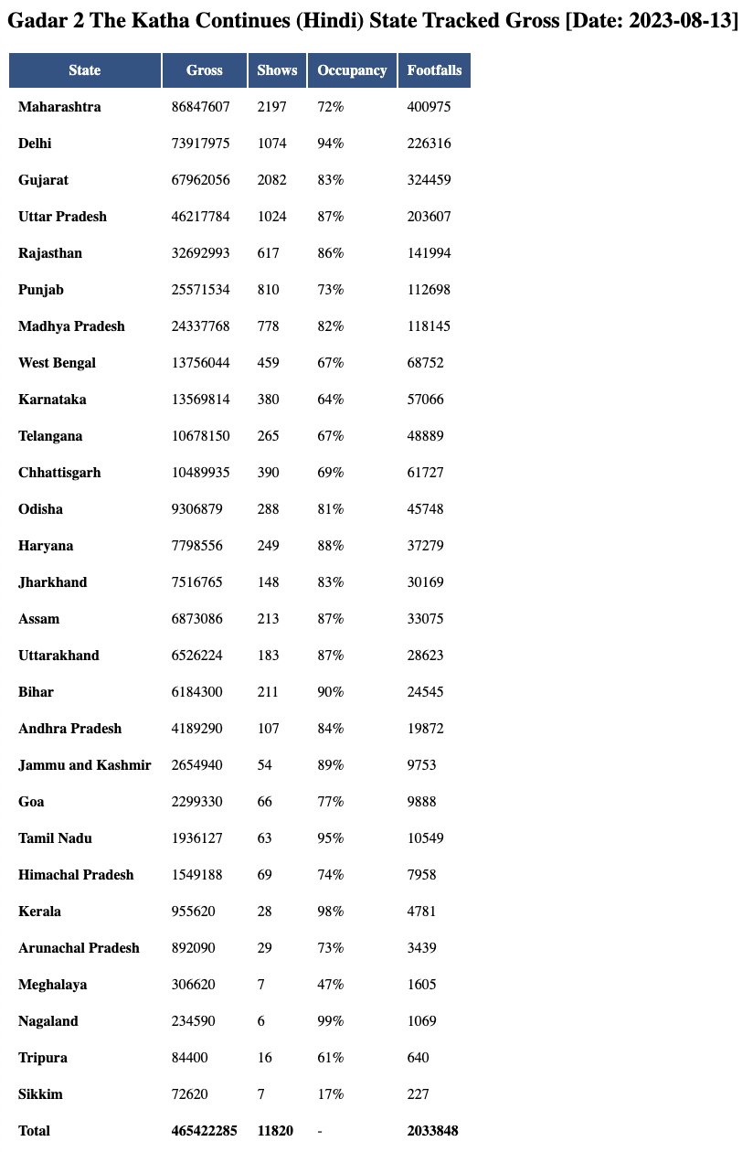 Gadar 2 Day 3 Hindi (2D) Occupancy in main regions